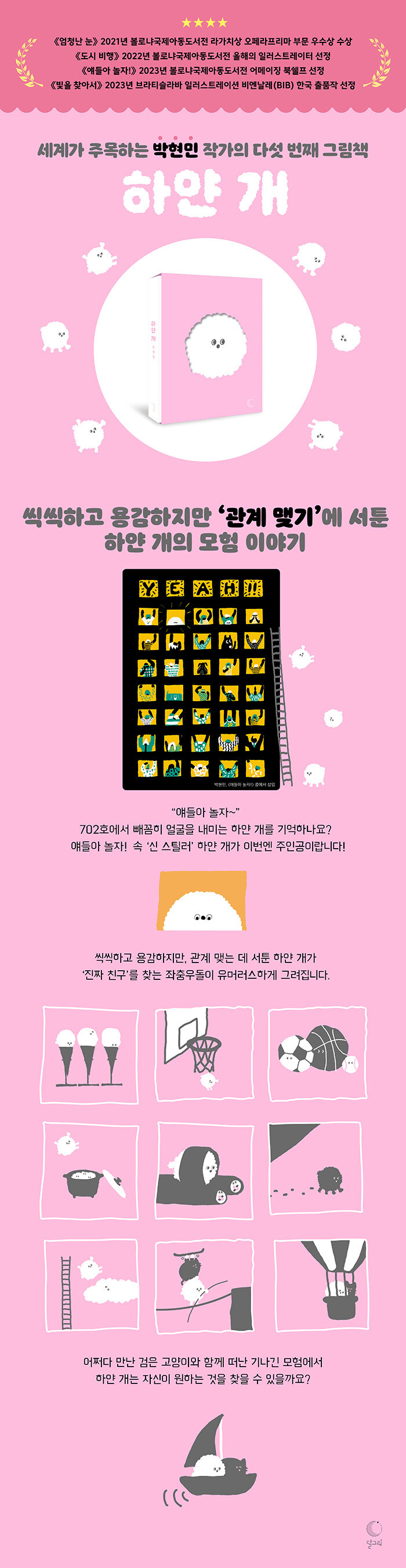 블랙, 화이트, 핑크로 완성한 그림책 《하얀 개》를 독자들은 어떻게 기억할까요? 한 손으로 ‘촤라락’ 책장을 넘기면 주변은 고정되어 있고, 하얀 개의 움직임은 애니메이션처럼 보이는 플립북이라고 기억할 수 있습니다. 가볍게 책장을 넘기며 읽으면 기발하면서 유머러스한 작가의 아이디어에 한바탕 울고 웃을 수 있는 책이라고 기억할 수도 있고요. 또 한 장면, 한 장면을 곱씹으며 읽으면 마냥 핑크빛일 수 없는 세상의 편견과 차별을 발견하고, 그 안에서 진정한 자아와 행복을 찾는 과정을 그린 우화라고 기억할 수도 있겠지요. 어떤 방식으로 기억되어도 상관없습니다. 책을 읽는 건 온전히 독자의 몫이니까요.